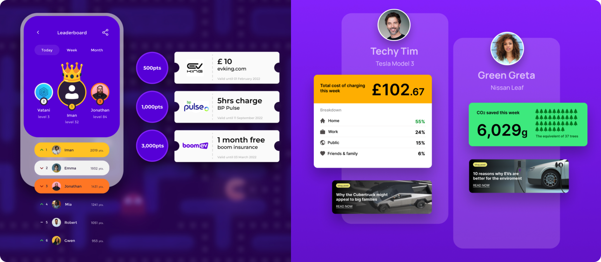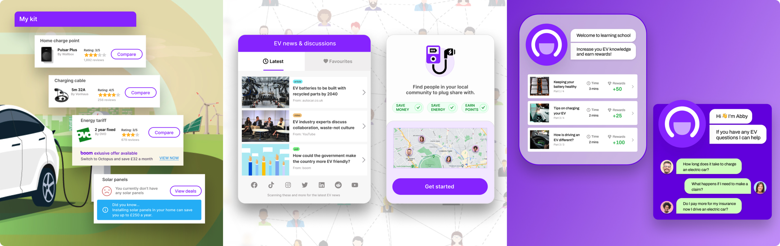 Developing future state product concepts including route mapper, charge point finder, EV shop, and gamification/community tools.
