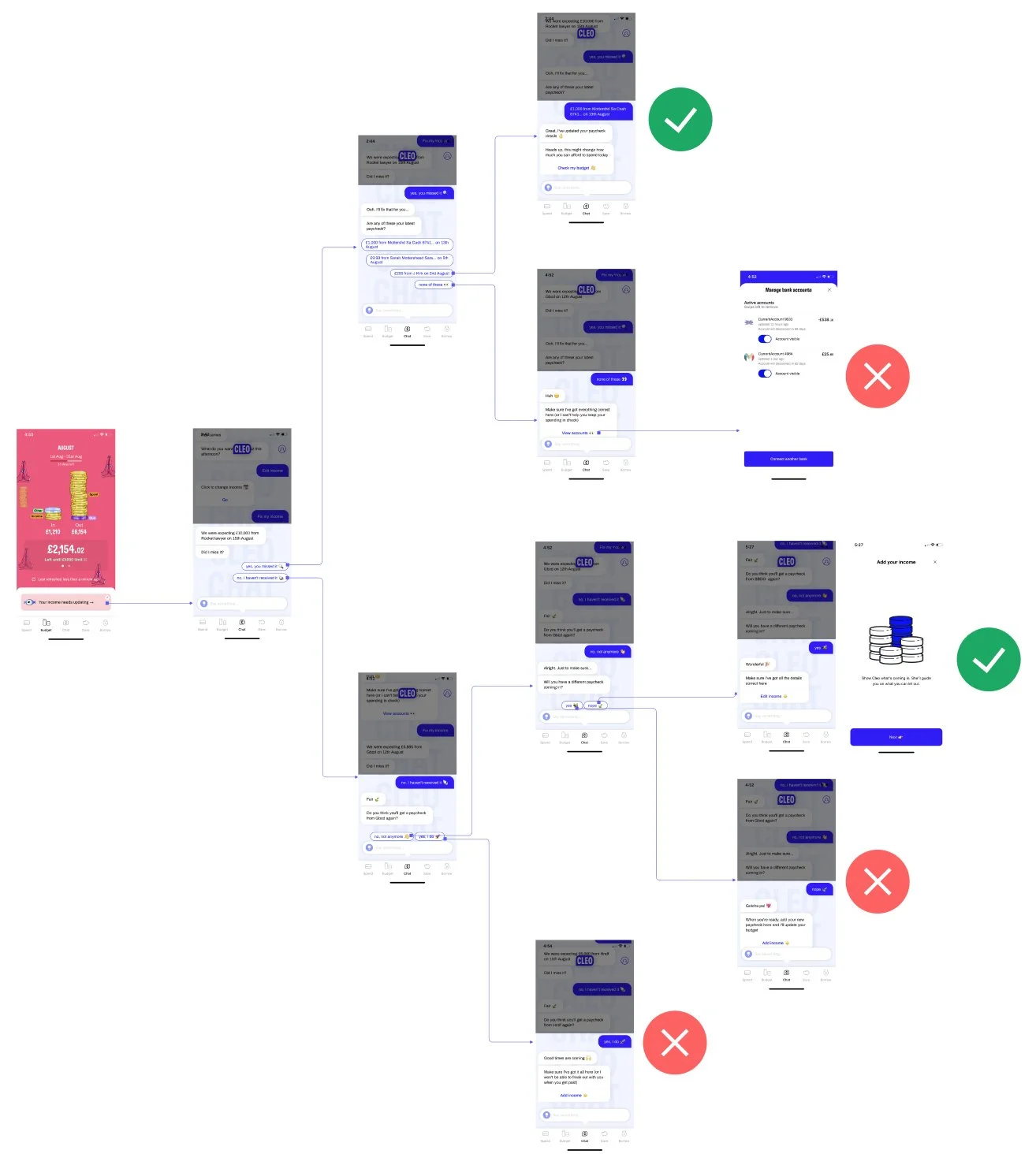 Furthermore, it paved the way for a new UX pattern that has been adopted by other parts of the product. Chat functionality (one of Cleo's most valuable assets) had never been used outside the chat tab before. Although there was some hesitation at first, the team loved how it could be used to inject Cleo's personality into boring flows and make them more interesting, exciting and engaging.