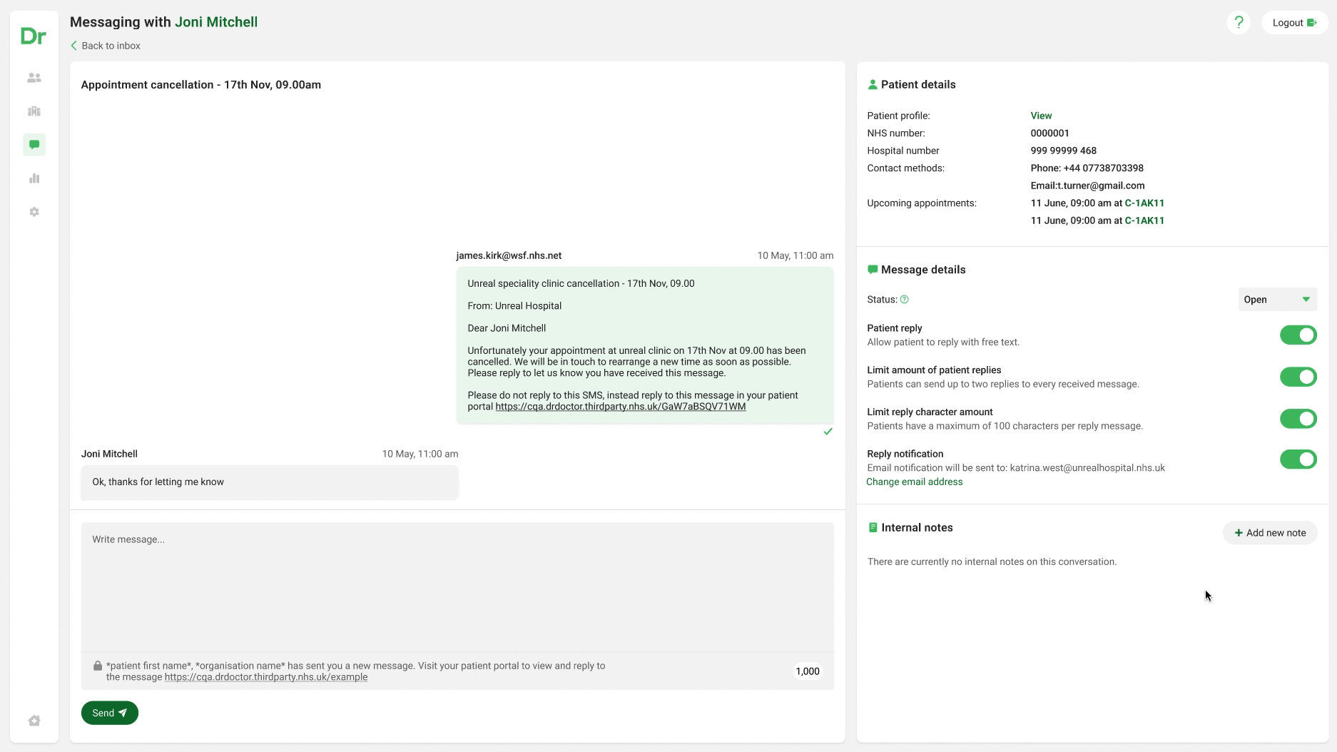 Internal Note Addition: This UX feature, positively received in research, allowed trust members to add internal notes to a patient conversation. It improved audit trails and subtly marketed the DrDoctor platform within the trust through growth hacking strategies.