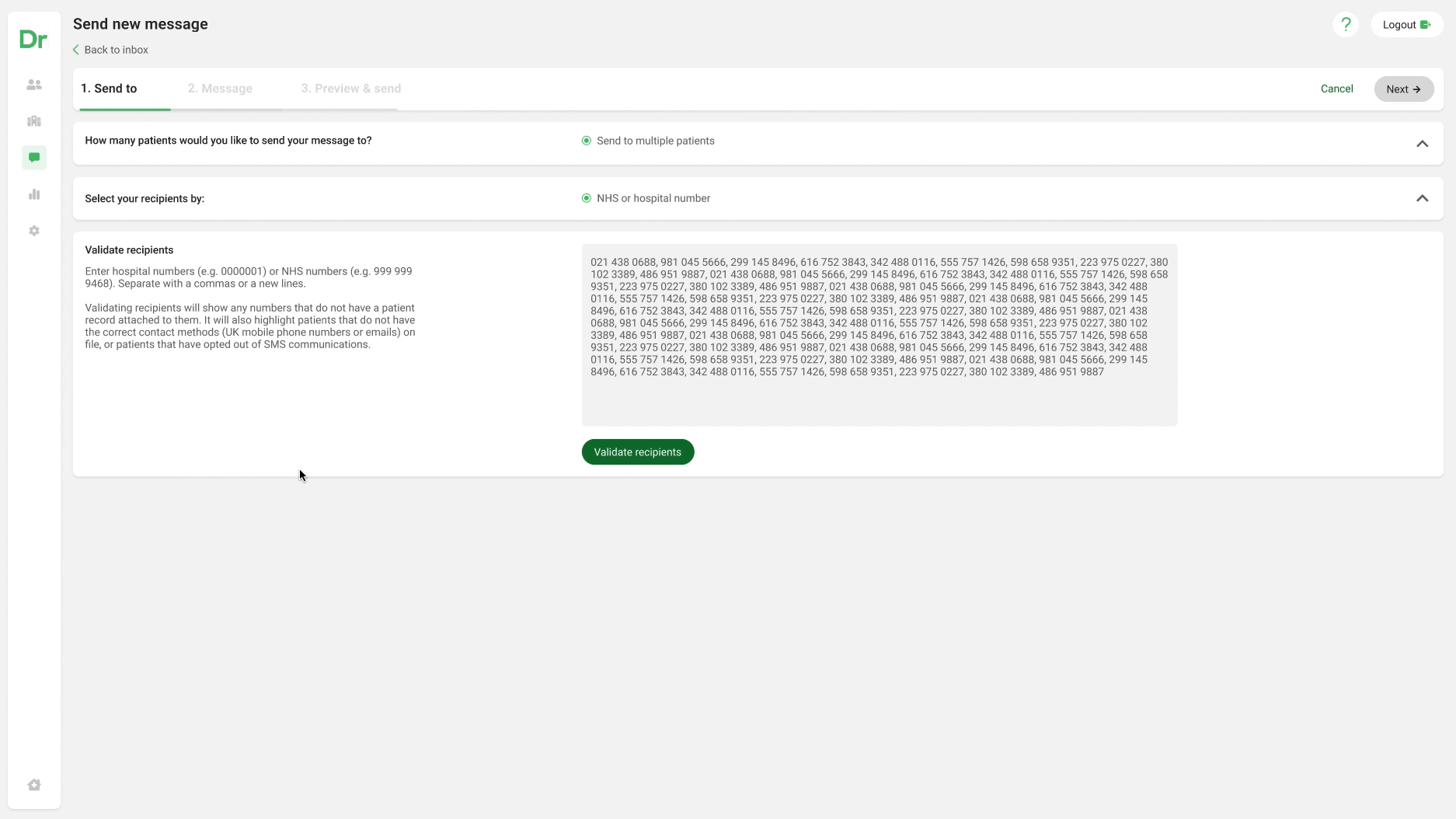 Recipient Validation: To address multiple-patient messaging, a UX solution was crafted to allow teams to validate contact details before message dispatch. This minimised error, saved resources, and identified patients needing alternative communication means.